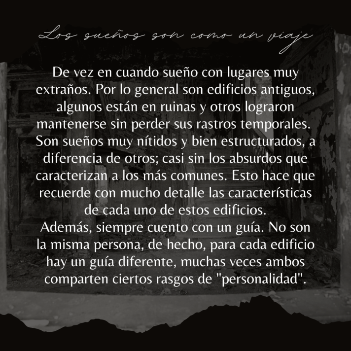 Si bien estos sueños han inspirado varias de mis obras, nunca se me asomó la idea de publicarlos directamente. A lo mejor no sirven como narraciones íntegras porque les faltan muchos detalles y bases, pero tal vez a alguien más le sirva como base para una gran historia.