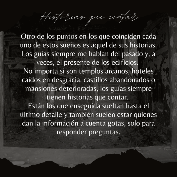 Podría consultar con mi familia e incluso en internet en busca de explicaciones intrincadas, pero a mí me gusta lo sencillo y obvio: me encanta leer, además, soy escritora, por supuesto que van a pasar este tipo de cosas. ¿Pero por qué edificios antiguos? ¿Por qué aparecen los guías y todo los demás? Bueno, supongo que una vez que tuve los primeros sueños así, el resto siguió un patrón definido.
