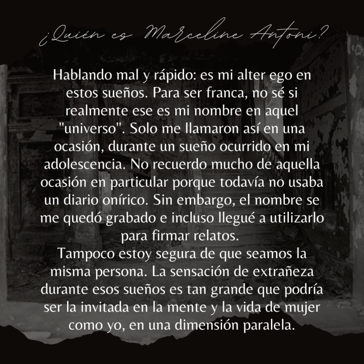 Aparte de eso está este misterioso personaje que solo apareció un par de veces en mis sueños, pero que me intrigó tanto, que automáticamente asumí que sería la protagonista de otros sueños igual de particulares: Marceline Antoni. Solo recuerdo que así me llamaron en dos sueños diferentes en los que yo no era yo, sino este personaje (no sé si me explico). Y dado que en estos sueños narrativos mi personalidad están extraña e incoherente con respecto a lo que soy en el mundo de la vigilia, siempre me he quedado con la idea de que yo no estoy viviendo esos sueños, sino que los veo en primera persona, a través de los ojos de otra persona.