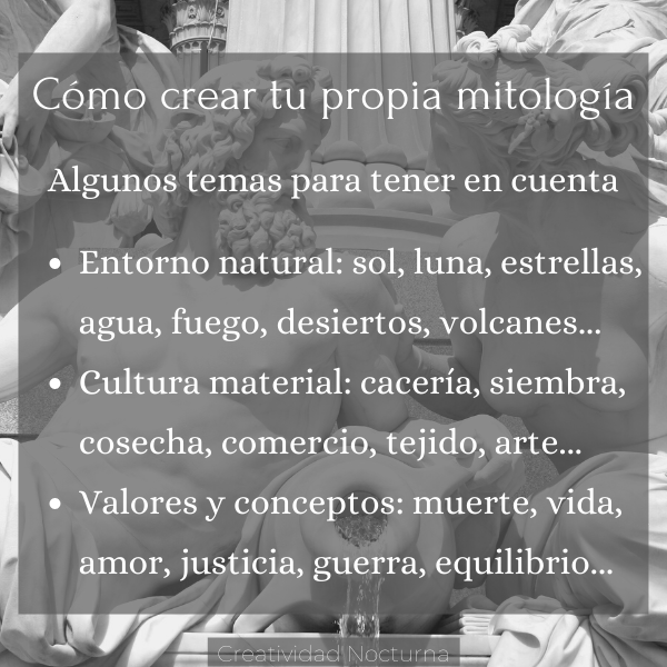 Para crear una mitología nueva no es necesario abrirse la cabeza. Solo hay que partir de las raíces conceptuales que también tomaron los mitos en nuestro mundo. Para comenzar, los mitos surgen para explicar el entorno de un pueblo, así que tendremos sin falta dioses relacionados con los elementos de la naturaleza: los astros, la tierra, el fuego, etc. Luego podemos matizarlo con características únicas que van a depender de la geografía y las costumbres del pueblo que diseñamos: ¿Qué dioses tiene un pueblo nómada de la selva? ¿Cómo explican las inundaciones y las tormentas? ¿En qué mitos basan sus jerarquías y relaciones?